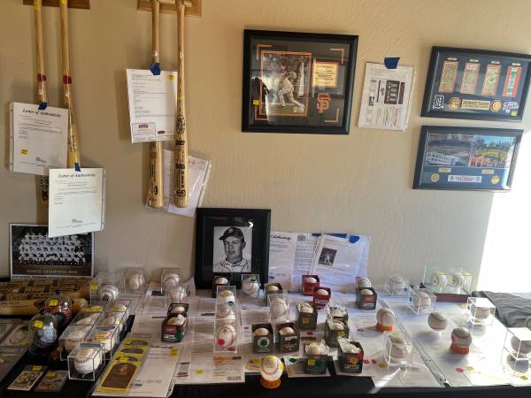 Sports memorabilia~ autographed bats, and baseballs from Detroit Lions and Giants, as well as jerseys jackets and other clothing. Autographed photographs,