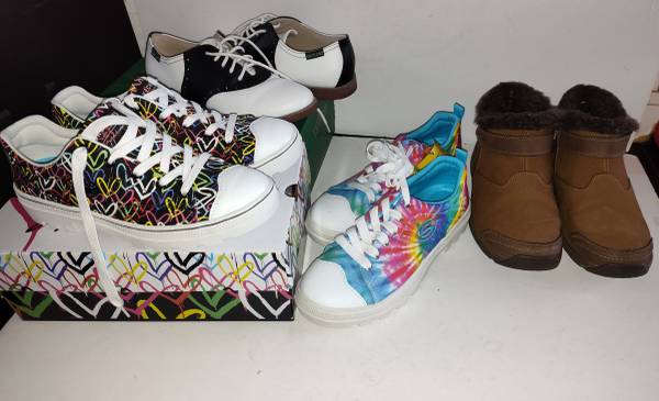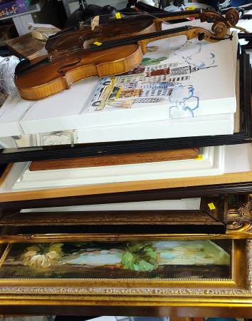 Collecting from estate sales: variety of artwork, wall art, women's clothing, costume jewelry, shoes, stereo, lamps, chairs, telescope, terracotta pots, tools,fine china, glass, puzzles and games.