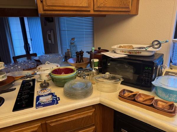 KITCHEN: Cuisinart toaster oven, KitchenSmith toaster, Kenmore microwave, Osterizer blender, crockpot, Proctor grinder, Sunbeam hand mixer, glassware, cups, baking sheets, utensils, mugs, tea pots, juice jars, knives, silverware, canister set, cookbooks, wooden wine racks, pots, pans, saucepans, vintage Pyrex, Tupperware, Belgium casserole, wooden salad bowls, platters, butterdish, Lenox dish set, Washington knives, tea cups, salt and pepper shakers, crystal, plus.