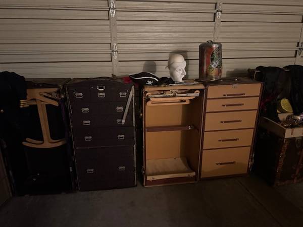 OUTSIDE AND GARAGE: Gardening pots, strawberry terra cotta pot, bicycle, house cleaning supplies, tools, and accessories, tools, ice chest, metal drain snakes, garden tools, dog igloo, pet travel crate, folding tables, pest control, backpacks, chainsaws, large camping thermos, shelf liner, hand saws, extension cords, tower fan, electrical supplies, monkey wrenches, screwdrivers, nails, hammer, drill bits, drill, jigsaw, sander, miter saw, circular saw, sand discs, circular saw heads, chisels, small fountain, humming bird feeder, round metal planter, ladder, mops, garden hose, brooms, dust pans, etc.