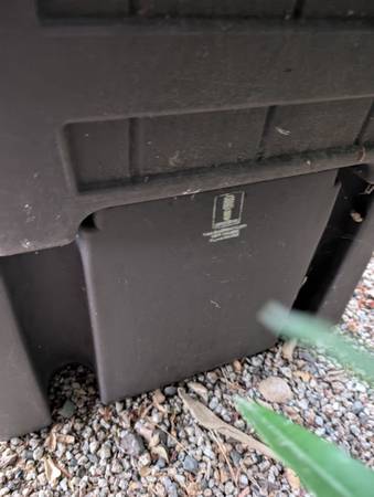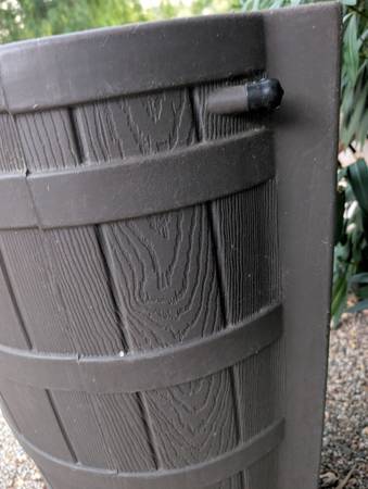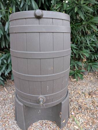 Made in the USA Good Ideas rain barrel and base. Was $150+$90 Has been stored outside behind shed, so dirty but otherwise good. Needs a new spigot.