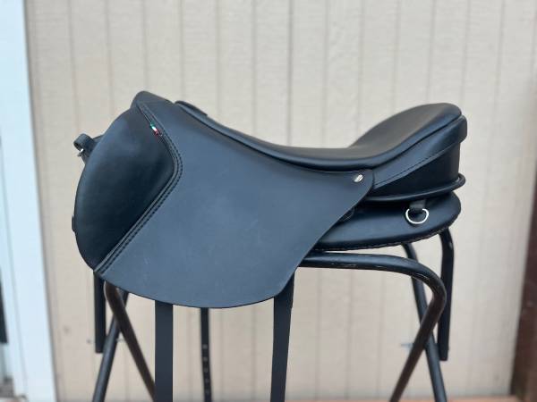 Ghost Ferrara 18” seat Black Micronappa with wide panels and extra front dees Without stirrups, this saddle weighs 10 lbs. Will ship.