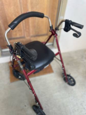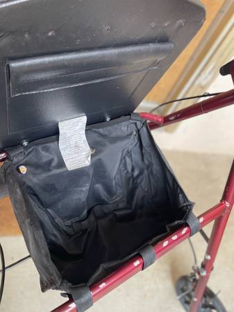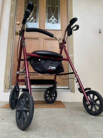 Carex rolling walker with a seat and storage beneath it. Comes with breaks and adjustable height. A few scratches however in great condition other wise. I also am selling a wheelchair and walker with arm support in other listings. Contact me with any questions. Thanks.