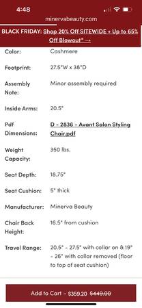 I have a basically new super cushy and comfy styling chair from Minerva. It’s the Avant in cashmere color. Beautiful warm tan faux leather, easily wipes down, incredibly comfy and cushy. Has a nice little opening in the back to easily blow hair out between clients. Comes with either a square base or a round base depending on what you like - I have both available. Shipping on a chair like this is equal to its value - I bought it for $365 and paid about the same in freight cost. You can snag this beauty that looks brand new for $300. Choose your base. Pickup only. Open to negotiations.