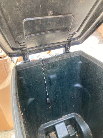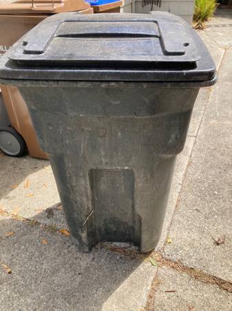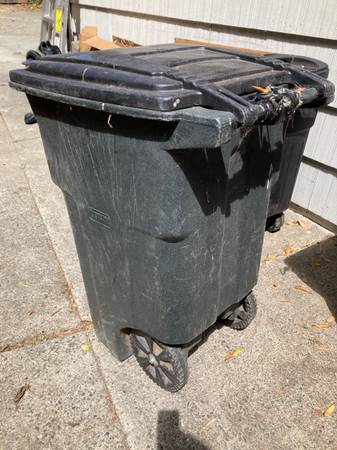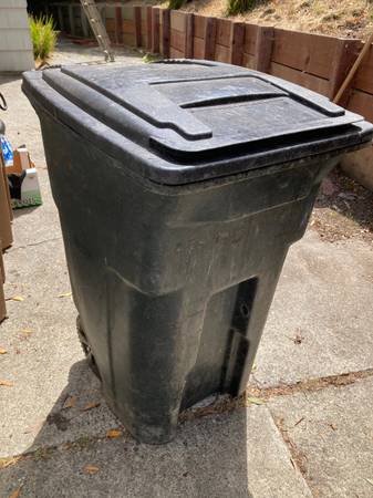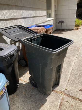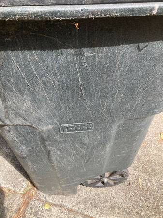 64 gallon black rolling outdoor garbage / trash can with wheels / easy to haul and move 42” tall 24” wide 32” deep Toter Brand We no longer use this size for our landfill / trash collection Mill...