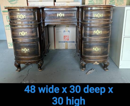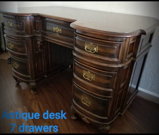 Beautiful antique solid wood desk with 7 drawers for sale. Good condition for its age and use. Intricate wood carvings.