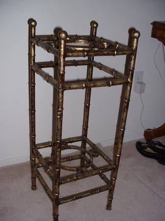 Metal, faux bamboo plant stand, antiqued brass color. Holds two plants. Would be easy to paint another color.