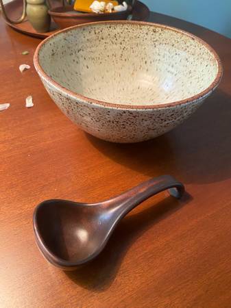 $100 for both Rare old vintage redwood glaze Edith Heath ladle / spoon Serving bowl from same mid century modern era with stoneware drip glaze bowl 9.5" diameter 5" high Both is perfect condition....