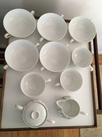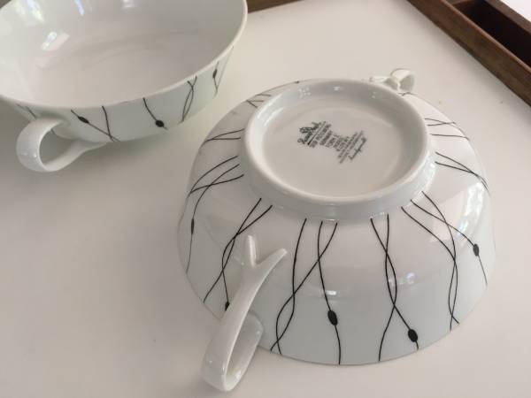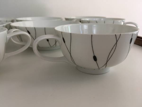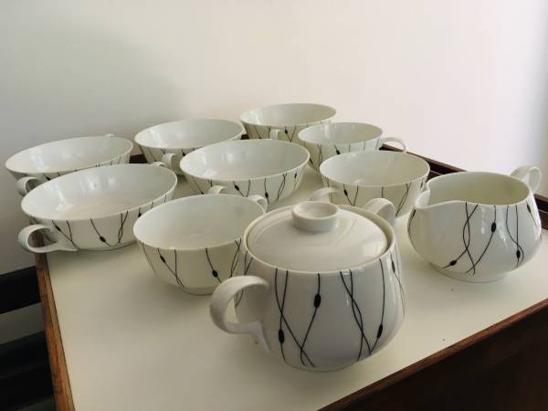 Modern design porcelain from 1960s. All pieces are in excellent condition. Rare design. "Fadenspiel" Coffee cups, creamer, sugar with lid, cereal or soup bowls.