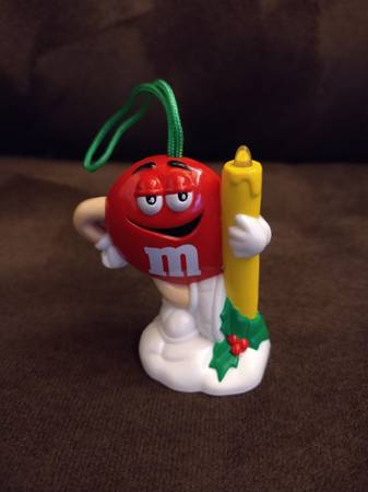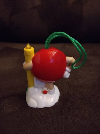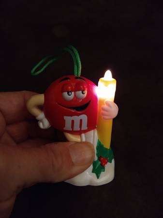 Red M&M holding a candle with holly. Has a string to hang as an ornament or a flat base to use a figurine. Measures approx 2.5"H x 1.5"W x 1.25"D Has a button on a back which you can hold down...