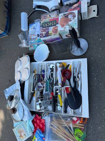Assorted kitchen utensils and gadgets including a garlic roaster, hand mixer, and more.
