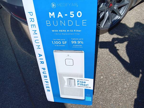 NEW IN BOX Medify MA-50 Air Purifier with True HEPA H13 Filter | 2,200 ft² Coverage in 1hr for Smoke, Wildfires, Odors, Pollen, Pets | Removal to 0.1 Microns | White, 1-Pack with ** ONE EXTRA FILTER **. Top Rated / PERFECT FOR EXTRA-LARGE ROOMS. Cleans large spaces up to 2,200 sq ft in one hour. Removes 99.9% of harmful particles including allergens, odors, VOCs, smoke, pollen, pet dander, dust, smog, contaminants down to 0.1 microns in size. *** Retail is $324.99 *** 1/2 PRICE AFTER RETAILER'S TAX ***