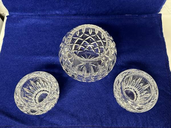 Royal Highlights collection crystal bowl (1) and candle vases(2) Excellent condition, hardly or never used Measurements: candle vase 3 ¼ BEST OFFER EMAIL COMMUNICATION ONLY, please check your spam...