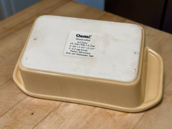 Used but well-kept CHANTAL classic mini stoneware loaf pan appears virtually new but with a minor spotting on the underside. Pan has goo heat distribution that promotes even baking. It has ergonomic handles and deep sides for efficient baking and serving. It has a non-porous semi-gloss ‘Marigold’ glaze that won't react with foods. The bottom is hand-sanded for a smooth, no-scratch surface. It’s easily to clean, dishwasher-, oven-, microwave-, and freezer-safe. The 2-1/2-cup rectangular loaf pan is about 5-3/4” L x 3-1/2” W x 2-1/2 H. It’s available for local pick-up in San Rafael, cash, Venmo, or PayPal.