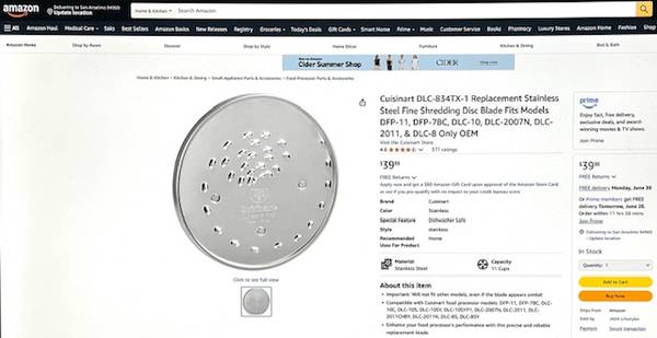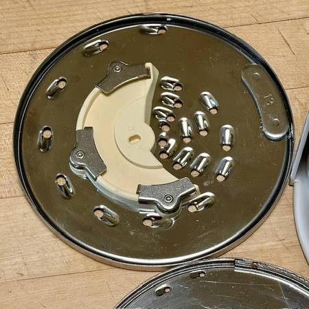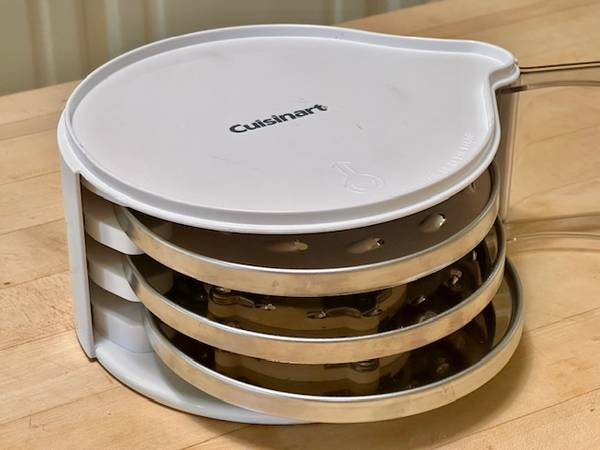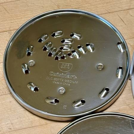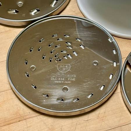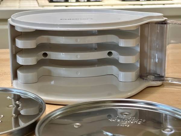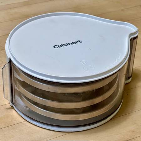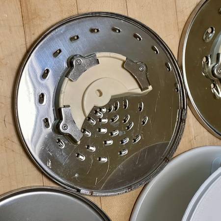 The discs appear virtually as new, but the fine shredder does have some light scour marks but fully functional. These come in the CUISINART White Plastic 3-Disc Set Holder DLC-8 w/swing-out clear door, stackable. New discs and holder are each priced in the $30-range, a bargain here for the 4-piece set, available for local pick-up in San Rafael, cash, Venmo, or PayPal.