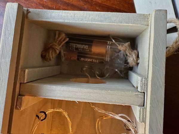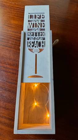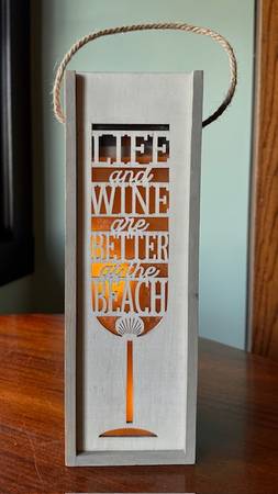 DEMDACO ‘Life and Wine are Better at the Beach’ Lighted Home Accent Wine Caddy, White/Pale Blue is about 13-1/2" H x 4”-sq. Used briefly, it appears virtually as new but without retail tags or packaging; it dates from about 2016. The laser-cut slide-out lid has a plastic diffuser behind it. The interior of the caddy has a battery compartment that houses a 2 – AA battery case w/On-Off switch and working batteries (included,) and a string of LEDs, all operational. It’s available for local pick-up in San Rafael, cash, Venmo, or PayPal.