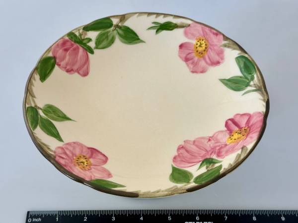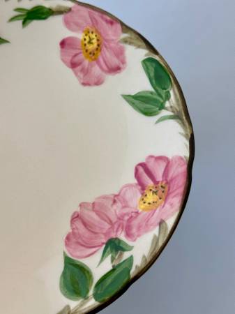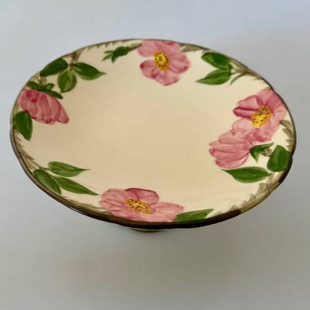 This is a vintage FRANCISCAN Earthenware Pedestal Serving Dish in Desert Rose Pattern, probably the most popular dinnerware pattern in the 1940’s and 1950’s. It is about 8"-dia. x 4” H, with a shallow concave bowl; it’s in virtually new condition…it has no cracks, chips, scuffs, or crazing. It’s evidently FRANCISCAN from its iconic ‘rose’ pattern but it is only back-stamped on the base with a numeric ‘14.’ Between 1934 and 1984, the ‘golden period’ of FRANCISCAN production, it was made by the huge Gladding, McBean and Co. plant in California. (After 1984 its production was moved to England, Portugal, and later in China.) The colorful and playful Desert Rose pattern was a American success story, distinctly Western with its wild, rugged ‘bramble’ appearance that paid no regard to European floral tradition. Each individual piece was hand-crafted using molds, firing, hand painting and glazing. It’s available for local pick-up in San Rafael, cash, Venmo, or PayPal.
