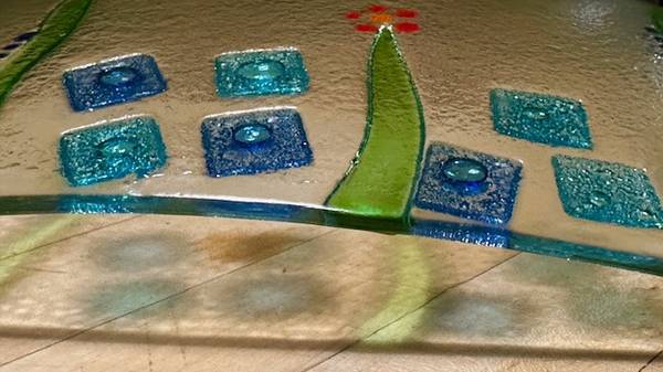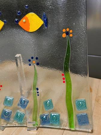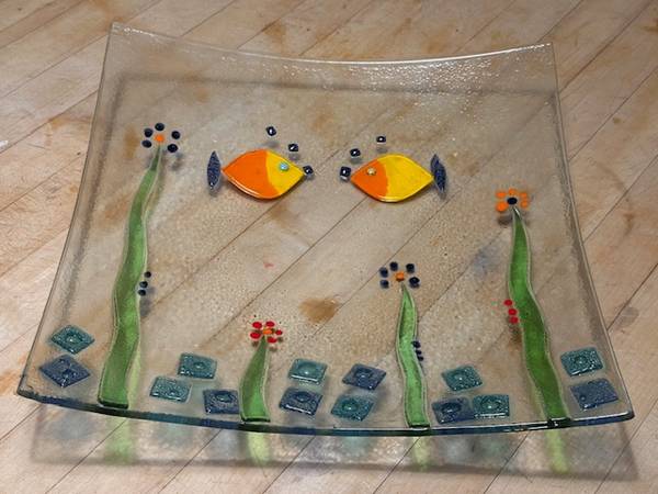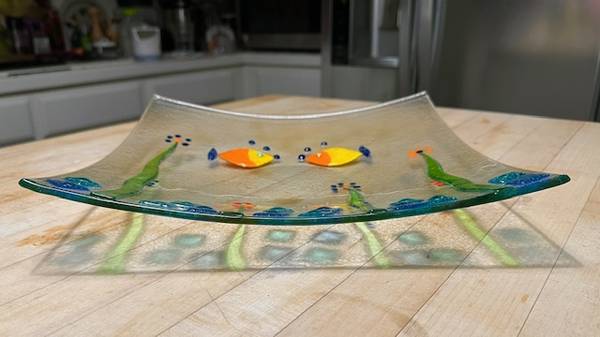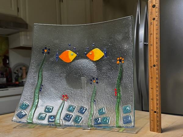 Fused Glass Underwater-themed Serving Platter is a kitschy vision of the ocean w/fish, bubbles, and seabed plants. Each piece of the scene is overlain on the base glass. In the kiln process the pieces retains their individual character w/soft and rounded. It is a food-safe square serving plate about 12”-sq. in a semi-spherical bowl-shape w/upturned corners, making it about 2-1/2” H. The leading edges are eased and smooth. The underside is canvas-textured w/4”-dia. flat bottom, so it sits firmly on a tabletop. It’s multipurpose, for use as a centerpiece, serving tray for fruit, charcuterie, and the like, or as a gift. It’s available for local pick-up in San Rafael, cash, Venmo, or PayPal.