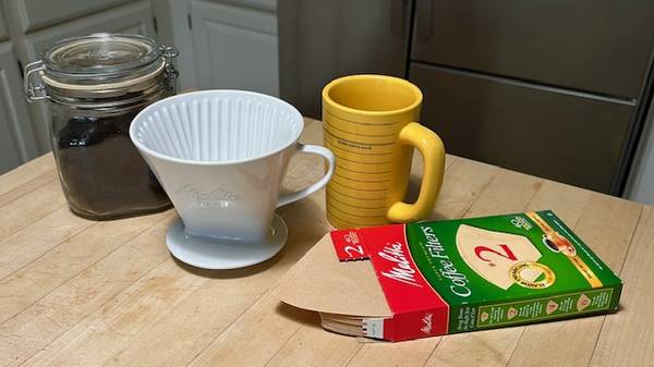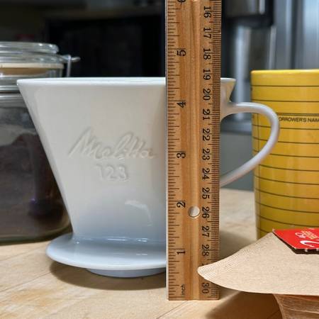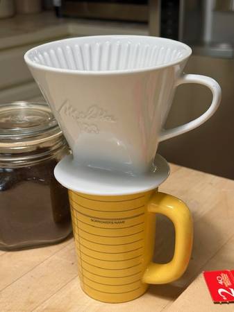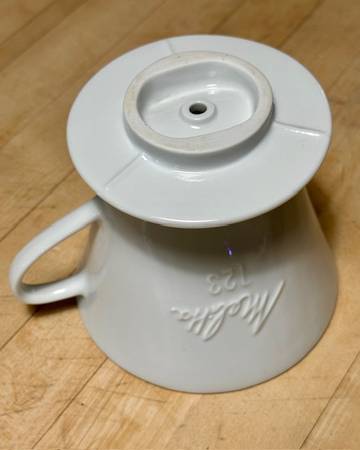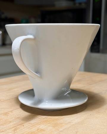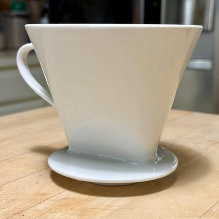 Its cone design affords optimal coffee flavor brewing and extraction. It uses #2 or #4 cone coffee filters (NOT included.) Its rim is about 4-1/2”-dia., on handle axis, 5-3/4” W; it stands about 4-1/2” H. While it might have been used, there’s no evidence; it appears virtually new, but without retail packaging. It is dishwasher safe. It’s available for local pick-up in San Rafael, cash, Venmo, or PayPal.