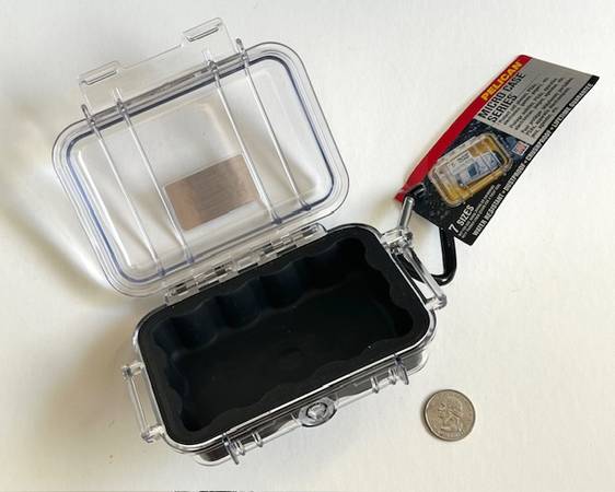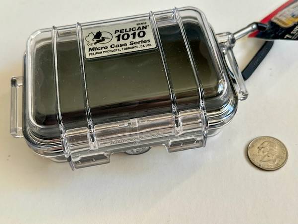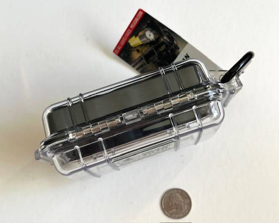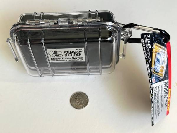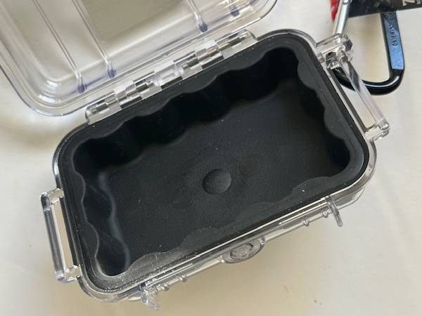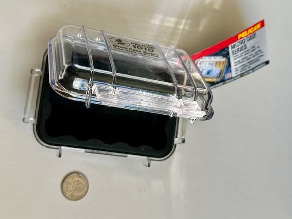 New, unused w/retail tag, Pelican 1010 Micro Case is water-resistant for 30 minutes when submerged at 3.3 feet. It’s crushproof, and dustproof protection for smart phone, camera, GoPro or other portable electronics and valuables. It has an automatic pressure equalization valve (balances interior pressure to keep water out) w/rubber liner that delivers O-ring watertight protection. Additionally, it has a carabiner, a stainless-steel hinge and latch pins that make for easy opening. It’s made in the USA. Overall, it’s 5.88" L x 4.06" W x 2.12" D; its interior, 4.37" L x 2.87" W x 1.68" D. It’s available for local pick-up in San Rafael, cash, Venmo, or PayPal.