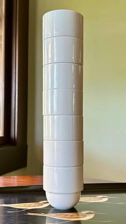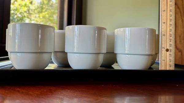 Set of 7 HASAMI-made White Porcelain Latte Cups are brand-new but without retail packaging. These stackable, modular cups are made in Hasami, Japan, but were designed in Venice Beach, California by Taku Shinomoto, owner of Tortoise General Store. These 10 oz. cups are pure white, with a light blue silhouette of Saki bottle printed in the bottom interior of each cup. They are 3-3/8”-dia. x 3-1/2” H, stackable w/rounded base that nest into the mouth of the underlying cups, somewhat in the style of the traditional Japanese Bento boxes. These cups retail in the $12 - $15 everywhere on-line, a bargain here for the set of seven (7,) available for local pick-up in San Rafael, cash, Venmo, or PayPal.