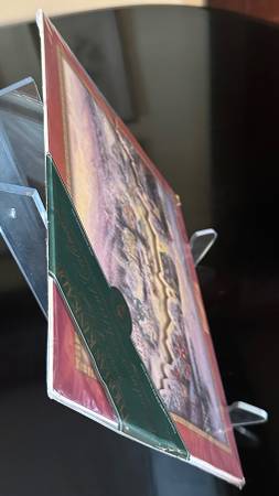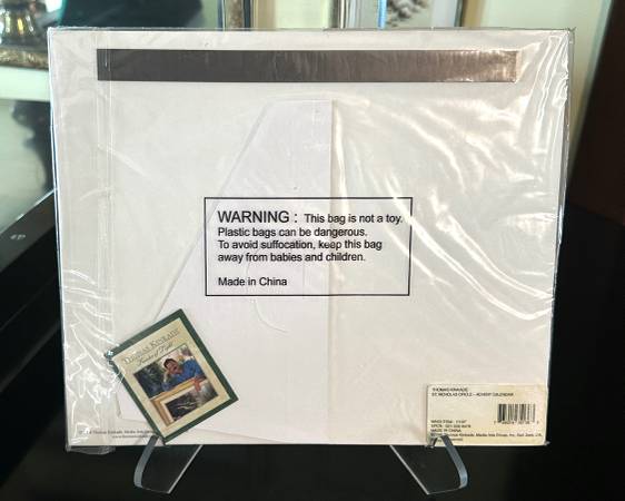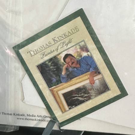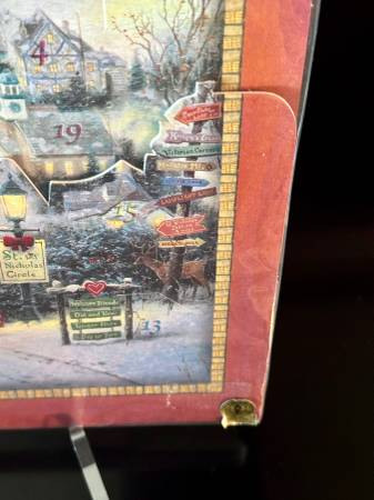 THOMAS KINKADE/Painter of Light ‘St. Nicholas Circle’ Christmas Advent Calendar is vintage 1998, brand-new old stock. It is 2-dimensional, about 12” W x 10-1/2” H but it does have a raised foreground landscape scene that adds a 3-D effect. It has 25 numbered windows within the St. Nicholas Circle scene, and a printed faux frame around the scene’s perimeter. The plastic magnetic mounting strip on the back has lost its magnetism over the past quarter-century but it still can be mounted tabletop with affixed fold-out easel. The calendar is sealed in its original plastic sleeve, within which is the Kinkade business card. It’s available for local pick-up in San Rafael, cash, Venmo, or PayPal.