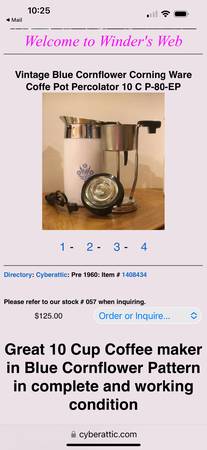 Vintage 1967 - 1972 CORNING WARE P-80-EP ‘Electromatic’ Coffee Percolator is from in-law’s estate - used but well-kept. Classic late Mid-Century Modern household staple, 10-cup capacity percolator is of CORNING WARE’s proprietary ‘Pyroceram Glass.’ It includes the ‘Pyroceram glass’ pot w/stainless-steel band and phenolic plastic handle, the integral coffee basket/percolator shaft and its cover, the removable electric heating element, the rigid plastic lid w/glass insert, and 36”-long P-6-HC power cord. Pot interior and all submersible metal components are spotless, coffee stain-free. The assembled pot is about 10-1/2” H x 5”-diameter and weighs about 4-1/4 lbs. Pot was recently tested and confirmed in good working order and fast-heating. It’s available for local pick-up in San Rafael, with cash, Venmo, or PayPal.