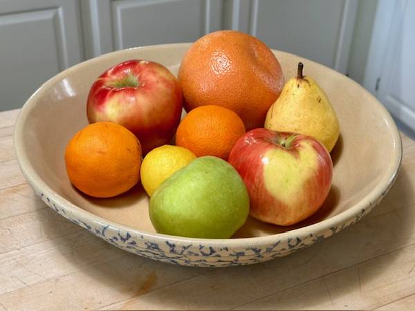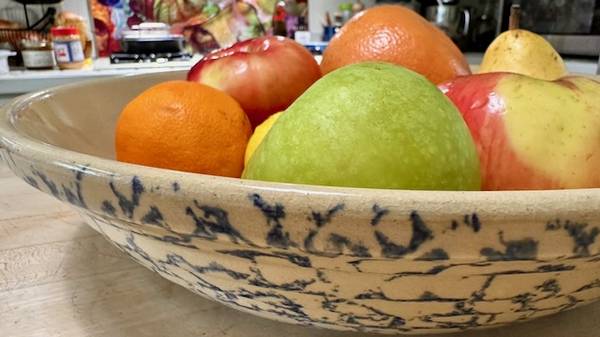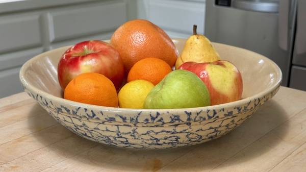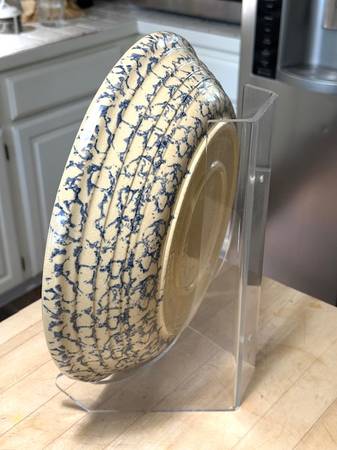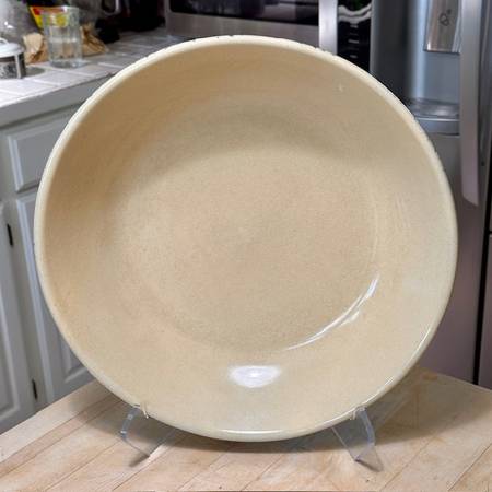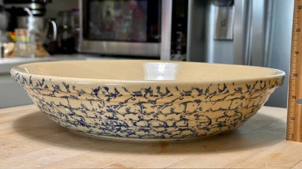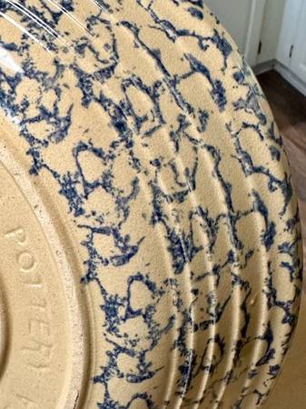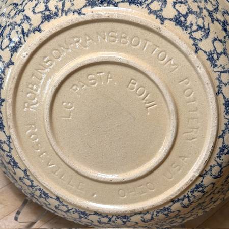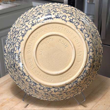 Vintage RRP Co Lg Pasta Bowl was made in Roseville OH ca. Mid-Century, possibly in the 1950s. As the name implies, it was marketed as a pasta serving bowl. The exterior is adorned with a Cobalt Blue sponge-applied finish in random pattern, the interior unadorned in natural clay finish, clear-glazed. The bowl is big, beautiful and somewhat heavy, weighing about 5 lbs. It is about 13-1/2"-dia. x 2-3/4” H. The RRP hallmark is imprinted on the bottom ‘Robinson Ransbottom Pottery Co Roseville Ohio USA.’ It appears as virtually new…no chips, cracks, or crazing. It would be well-suited for a cottage- or farmhouse-décor, and other possibilities, too. (The company was established in 1900 and remained in operation for over 100 years. At its closing, the company claimed to have been the oldest continuously operating stoneware factory in the U.S. and the world's largest manufacturer of stoneware crocks.) This bowl is great for personal use or as a decor piece, and a wonderful gift for an avid pasta-maker or vintage stoneware collector. It’s available for local pick-up in San Rafael, cash, Venmo, or PayPal.