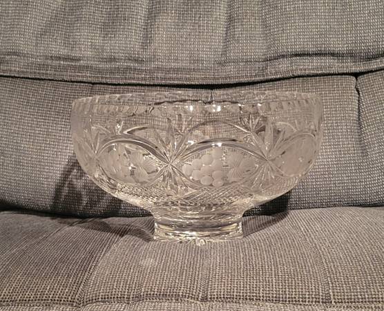 Large glass bowl, 9” diameter. Grape motif etching around perimeter.