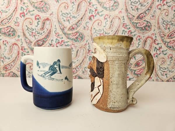 2 MUGS BLUE SKIING MUG...$10.00 KING CLAY MUG....$15.00 CASH ONLY