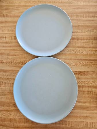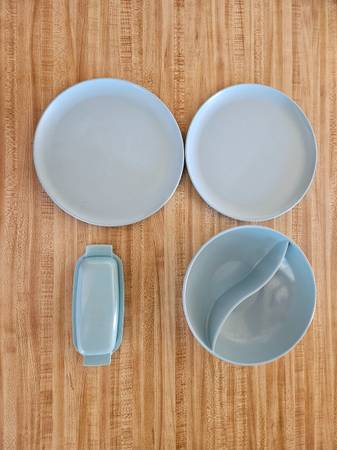 VINTAGE MCM MARCREST MELMAC TURQUOISE 9.5"...3" DEEP DIVIDED SERVING BOWL....$20.00 BUTTER DISH WITH LID.....$10.00 2 PLATES FREE WITH PURCHASE MADE IN USA