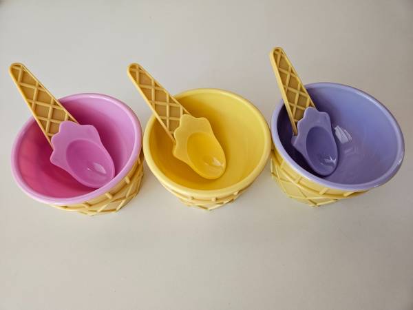 3 KIDS ICE CREAM DISH WITH MATCHING SPOON ALL NEW AND IN EXCELLENT CONDITION $10.00 FOR ALL 3