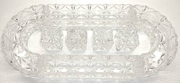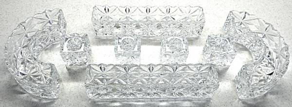 This is a beautiful, one of a kind, multi-faceted leaded clear glass floral arrangement centerpiece. It can be configured in numerous creative ways and decorations can be changed for various festive holidays. The 4 smaller pieces measure 2” square and have an indentation in which tapered candles can be inserted.