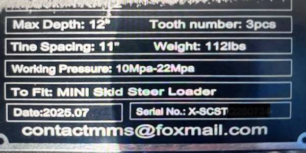 Mini skid steer ripper Max depth: 12” Time spacing: 11” Weight: 112lbs 3 teeth Attachment plate measurements in pics (approx 24” x9”)