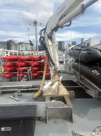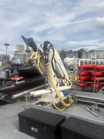 Spanish made Knuckle Crane (Toimil) and Control Stand. There is no HPU sold with the crane. All mechanical features works and is in operation currently. Some of the limit switches do not work. Allied Crane in Oregon is the Toimil authorized service provider. The crane is being replaced with one that is of Marine Grade. Crane is available for pickup on Mare Island on or after 15 November but can be delivered within 100 miles of Mare Island.
