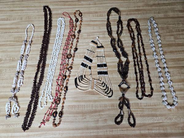 ASSORTED NECKLACES MADE FROM SEEDS, BEADS AND SHELLS ALL LONG LENGTHS MANY VINTAGE AND IN EXCELLENT CONDITION $10.00 CASH EACH NECKLACE $75.00 CASH FOR ALL 9