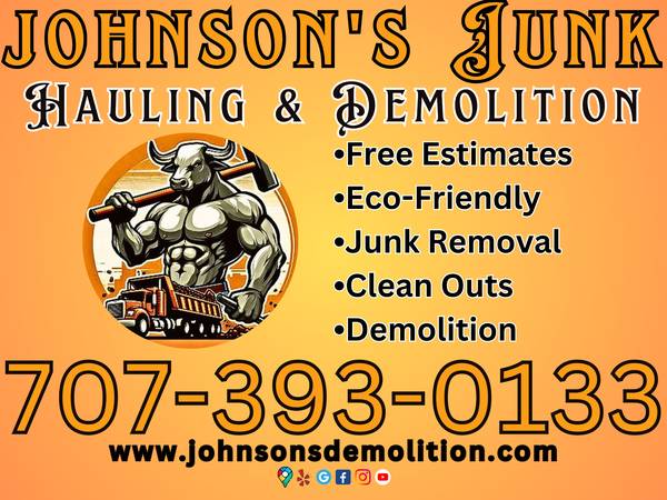Johnsons Junk Hauling and Demolition was established in 2015, 10 years ago when I was taking entrepreneurship class at Petaluma High School. We have been successfuly operating in the NORTH BAY, and have plenty of experience in the JUNK REMOVAL/HAULING industry. We have started, worked on, and completed thousands of jobs to 100% customer satisfaction, with references upon request.