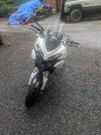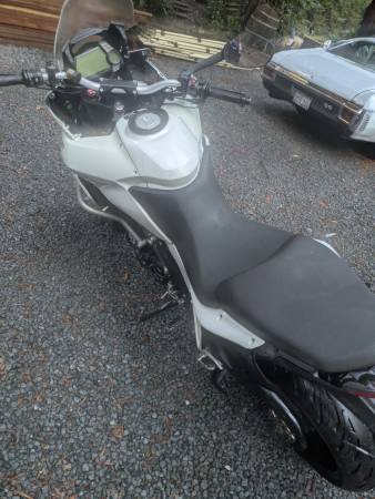 It was parked on kickstand, and car drove by and hit the rear luggage rack(after market). Broke the back fender and turn signal, the front hand guard and clutch lever. It never came off of kickstand. Their insurance company had no local adjuster so they declared it a total loss. It runs great, new chain and sprockets,100 miles on new set of Michelin Road 6 G tires. Great track bike, or put back on road or collection of parts? Serious only, No Trade