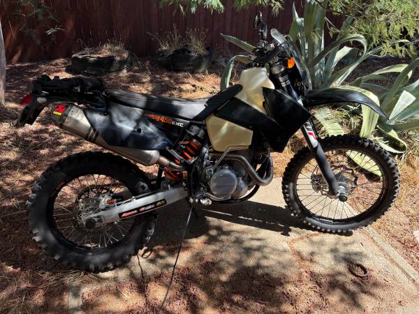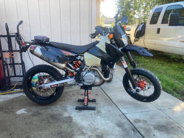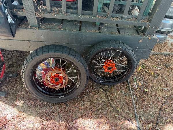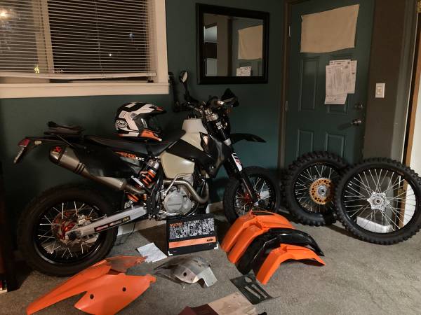 Comes with 17" KKE black and orange supermoto wheels with Perelli scorpion tires and cush hubs, a bumper hitch carrier/rack, hydraulic bike stand, plastics, skid plate, original owners/service manuals, etc. $4000 Or trade? I need an enclosed trailer.