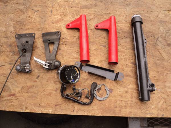 $20 for all of it. I don't know what they fit. I think the red headlight mounts are for a vintage Hodaka or Honda. The fork leg is made in Sweden, My guess is Husqvarna. Calls only -Erik----no texts...