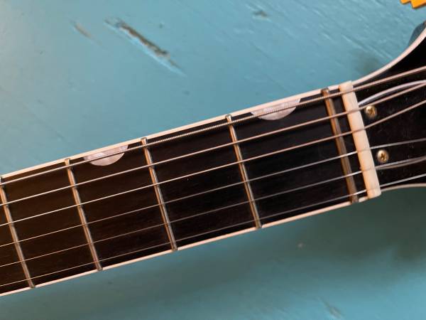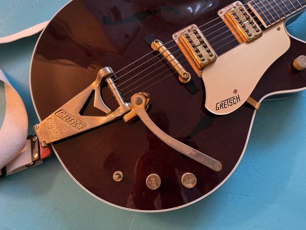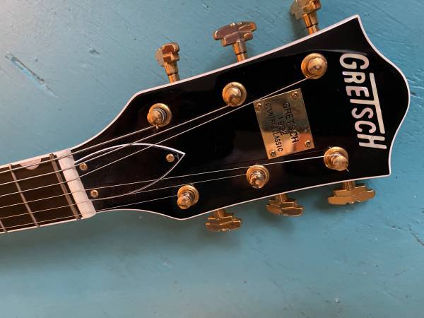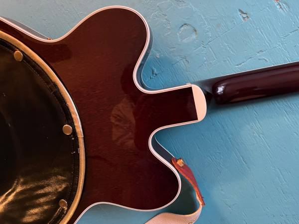 Here we have a Gretsch “1962 Country Classic.” Japanese made in 2005, this is one quirky guitar. It has a zero fret, a kill switch, and a butt-ugly padded back. It also has great sounding Filtertrons, a smooth and true soft C shaped neck, and Grove Imperials. Factory hard shell case. At first glance, it appears black, but it is actually a very dark walnut stain. It sounds great, feels great, and the butt ugly padded back, that nobody but you will know about, feels nice and soft and protects it against your belt buckle rash. Very good condition! A steal at this price.
