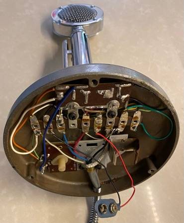 Classic crystal element microphone with stand mounted switch, ¼” connector and base located volume adjustment. This one has a 1965 dated schematic on the inside of its base. When I bought it used in 2002 it had this same ¼” connector. As I was testing it in order to sell it this week I learned from internet sources that some models had a battery in the base for a pre-amp, and this one had a badly corroded 9 volt battery. When I tried to remove it, one of its terminals snapped off in the battery connector. I replaced the connector with a new part, but when connected to an amplifier with the battery installed the mic would feed back, so I removed the battery.