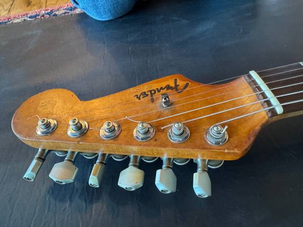 original vintage 1963 fender Stratocaster. Plays like butter. Low action and amazing tones. The neck and body and some parts are original with some modification (what's original: back plate with serial number, jack/jack plate, tremolo arm, bridge (new saddles and brass tone block), tremolo spring anchor. Body was refinished (original color was olympic white) and some of the wood down by the toggle switches and pickup pockets was carved away to fit the switches and possibly to lighten the body. Body has been refinished. All electronics have been changed out and modded. Tuner holes have been slightly bored out for oversize locking tuners, would need conversion bushings to mount old style tuners. Pickup switch has been changed out for a Brian May style 3 dip switch selection. (up is in phase, middle is off, down is out of phase). As for the sound, the wood is nice and resonate even when played without an amp. Neck feels great. This guitar has been played for ages, feels good in the hands and sounds great.