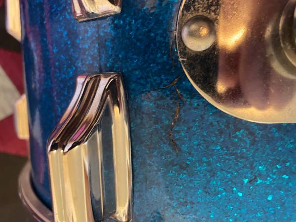 I have 1 Rogers 8X12 Blue Sparkle tom w/ flat grey interior. the collet is machined, but missing 1 wing. Very minimal pitting & rust, nothing a Dawn bath wouldn't help. There is some small micro cracks in the wrap (you can see them in the pics, those little black lines). Has original Rogers/Ambassador coated heads & internal muffler. serial #: 51881