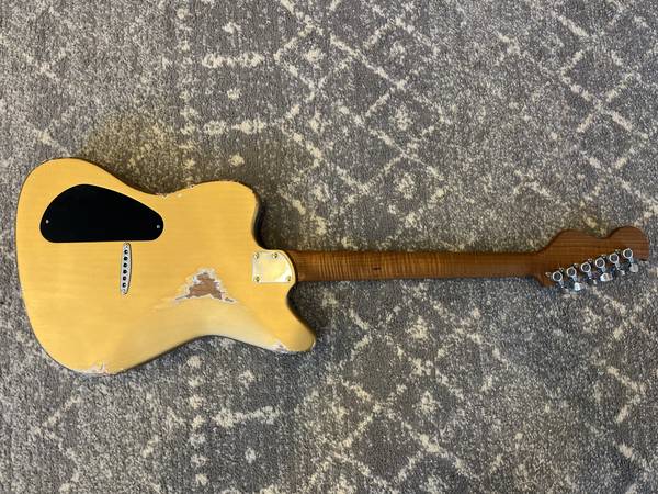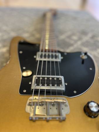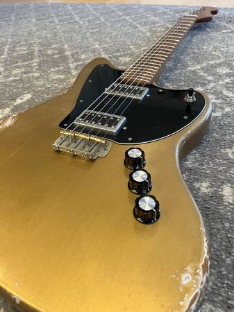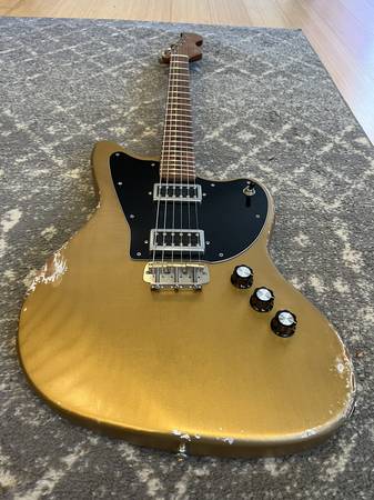 Nicely balanced Jazzmaster style guitar, hardtailed with custom wound humbuckers. Plays great and the neck is super smooth. Here are the other specs: