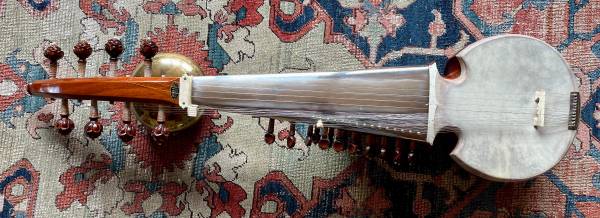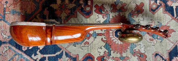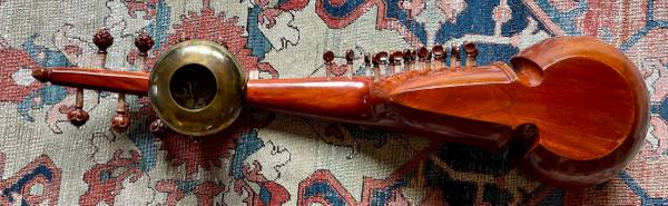 This is a rare one piece sarod made from a beautiful piece of tun wood. Near perfect condition. Recently reskinned and restrung.