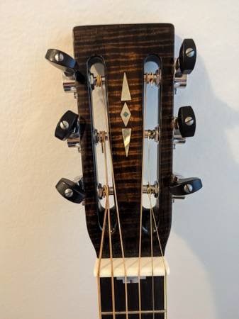 This is a truly one-of-a-kind Scheerhorn with unique features. This is the only slot head guitar Tim made. The bottom of the fretboard is slightly different from a standard one and the neck binding and inlay are also unique to this guitar. Before I owned it, it was dropped/cracked and repaired by Tim. It's incredibly difficult to see the repair. I brought the guitar to Tim last year, he set it up and gave it a clean bill of health. It has a strap lock installed. This guitar plays great and sounds beautiful. It has a lot of clarity and power. If you are looking for a unique and collectible resophonic guitar, this is the one for you. Comes with hard shell case. This is a wonderful sounding guitar.