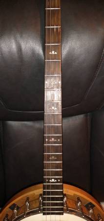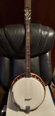 Banjo Orpheum #1 Plectrum 4 string with Resonator made 1921 by Rettberg & Lange in New York in excellent condition for $645. This beautiful all original Banjo made of Birdseye maple wood for the neck, rim and a beautiful