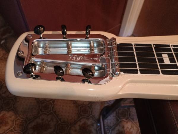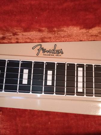 Fender Champ Lap Steel Guitar made in 1963 in near mint condition with original case for $2,000. This beautiful Ash body, lightweight cream colored Lap Steel Guitar has a single coil electric pickup the same pickup in America vintage Telecasters. All the parts, pickup, body, knobs and brown tolex case with leather ends is original. I have seen Hank Williams Jr. in Concert in 1985 playing the same model Fender Champ Lap Steel Guitar 6 string cream color playing the great songs of his father. This Fender Champ Lap Steel Guitar 6 string is perfect for all styles of music including Traditional Country, Hawaiian, Blues, Rock music and more. Fender Champ Lap Steel Guitar 6 string cream color, Gibson, Slide guitar, Dobro, Banjo, Mandolin, Pedal Steel Guitar, Bluegrass, Champion Lap Steel Guitar, Deluxe 8 string Steel Guitar