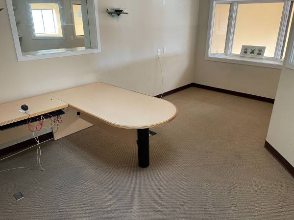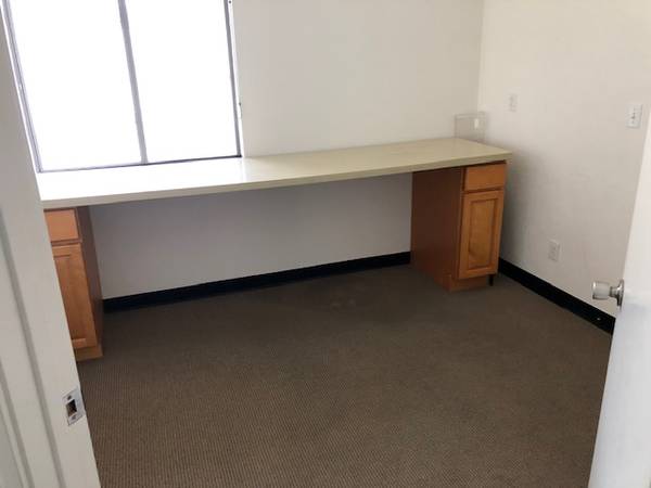 There are two furnished offices available, 1) Suite C is ~100 square feet/rent at $380 month, or 2) Suite A is ~198 square fee/rent at $510/month. Both available offices have new carpeting and have new/fresh paint. Furnishings include large desks and a few other items.